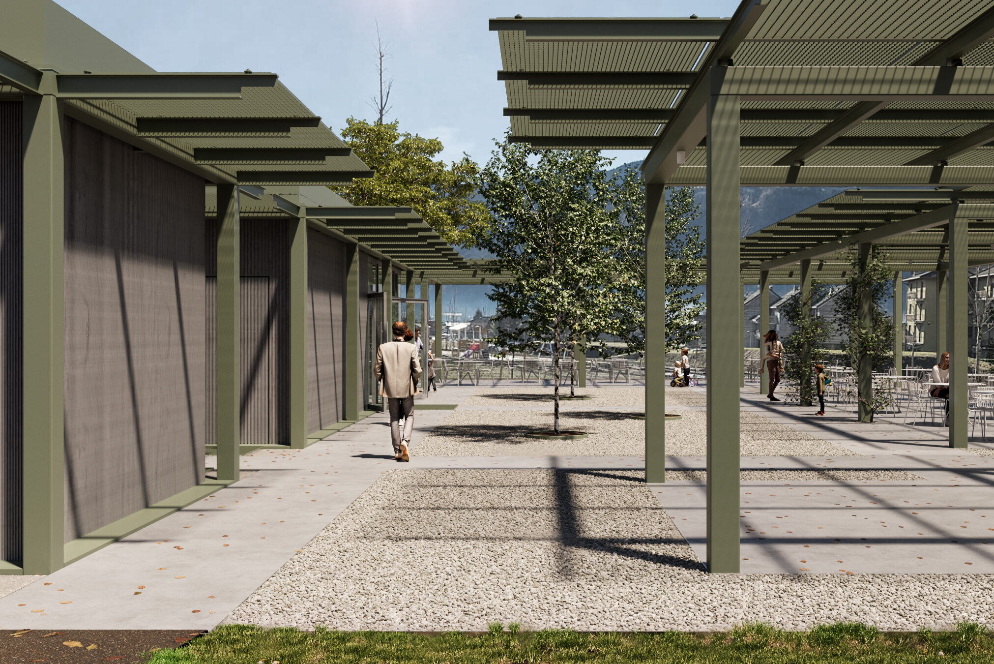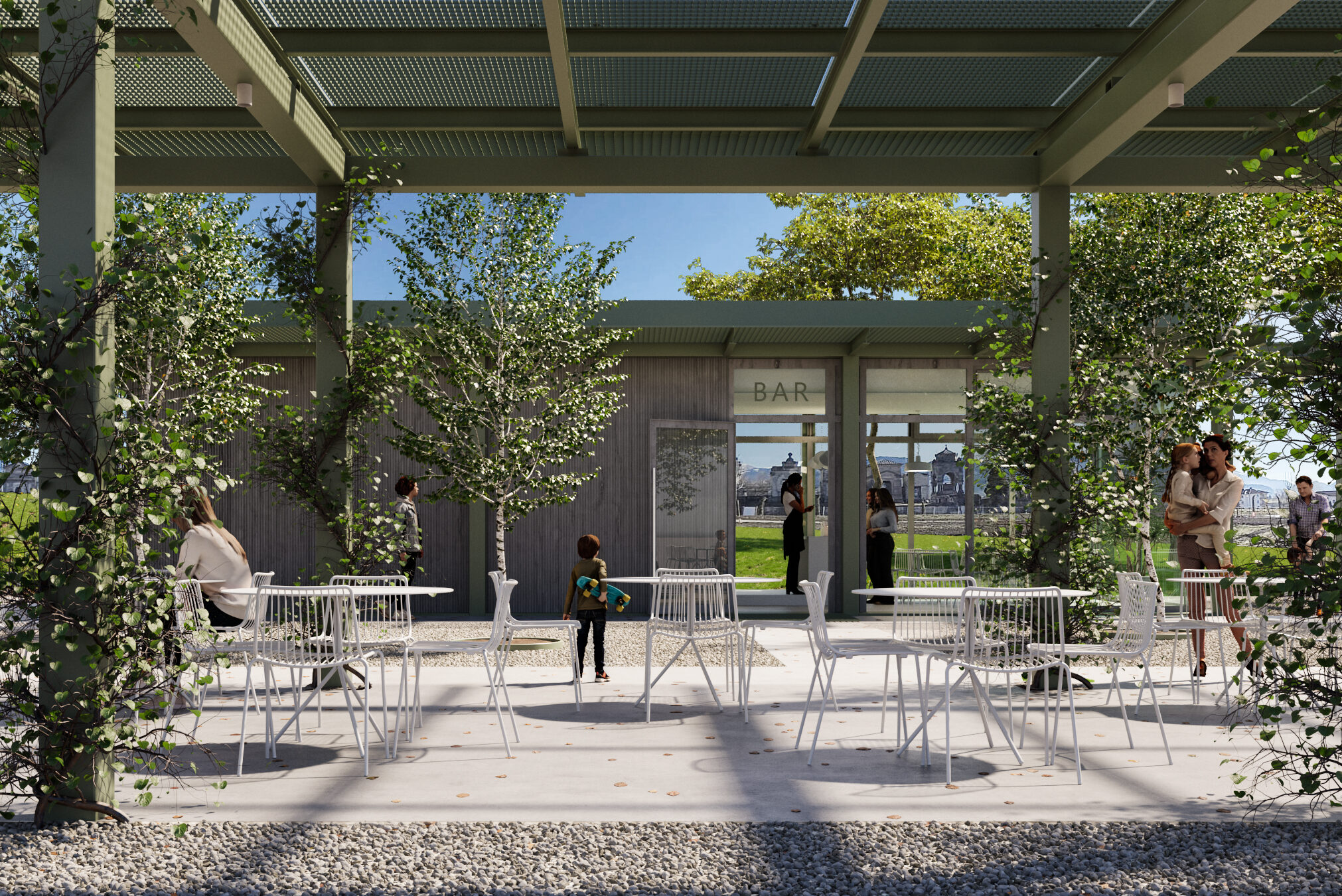 Des formes géométriques pures pour un petit pavillon niché dans la verdure. L’intervention s’inscrit dans le cadre du projet du nouveau parc de Clusone, un vaste espace vert aux portes de la commune de la province de Bergame. L’objectif est de définir un volume simple et extrêmement clair d’un point de vue compositionnel et structurel. Pour cela, une large dalle surélevée de 50 cm du sol accueille 3 volumes contenant un bar, des services et un local pour le rangement des outils d’entretien du parc. Les matériaux sont peu nombreux : le bois pour les trois volumes, la charpente métallique peinte en vert sauge et la lumière qui pénètre à l’intérieur du pavillon à travers de fines lamelles.
