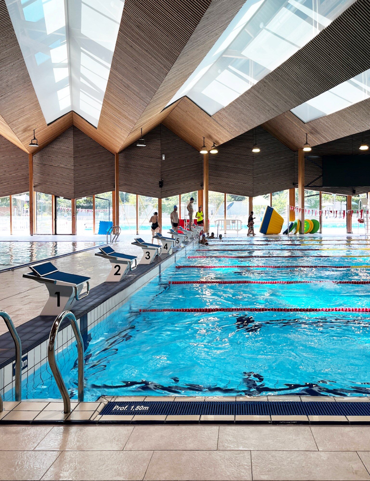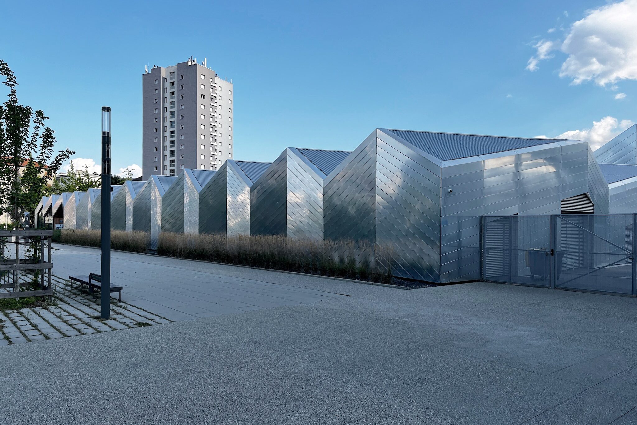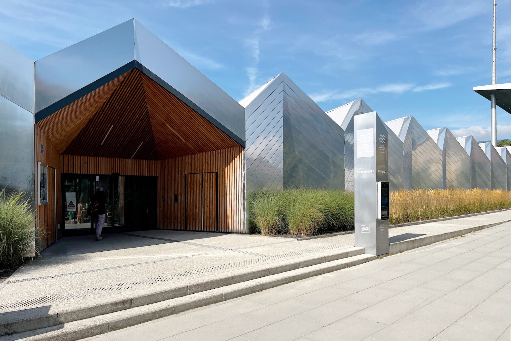 La proposta di progetto per il centro natatorio di Chambery parte dallo sviluppo del tema della piscina inteso come contenitore architettonico associato ai seguenti temi: spazi verdi, sport, salute, socializzazione, studio. L’analisi del contesto ha condotto alla definizione dell’impianto urbano e alla caratterizzazione dell’edificio attraverso un solo elemento architettonico: la copertura. La forma dei vicini capannoni industriali e la ripetizione formale dei tetti delle unità residenziali a Est e a Sud del sito diventano il motivo di composizione della copertura e della facciata. L’organizzazione degli spazi interni dell’edificio tende all’ottimizzazione delle superfici rispettando le quantità prescritte e mira, attraverso lo studio dei flussi dei diversi utilizzatori, alla distinzione funzionale per una migliore utilizzazione delle diverse unità. L’utilizzo dei due materiali principali per il rivestimento esterno e per la copertura, l’alluminio e il vetro, esalta la composizione delle facciate con un’alternanza di fasce opache e vetrate.