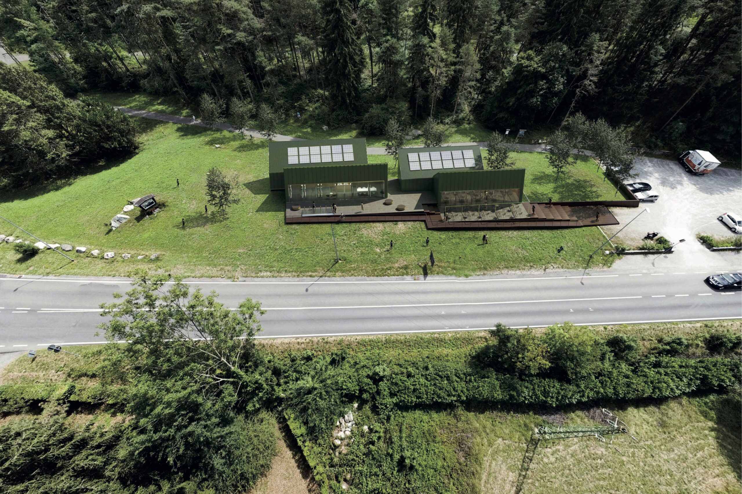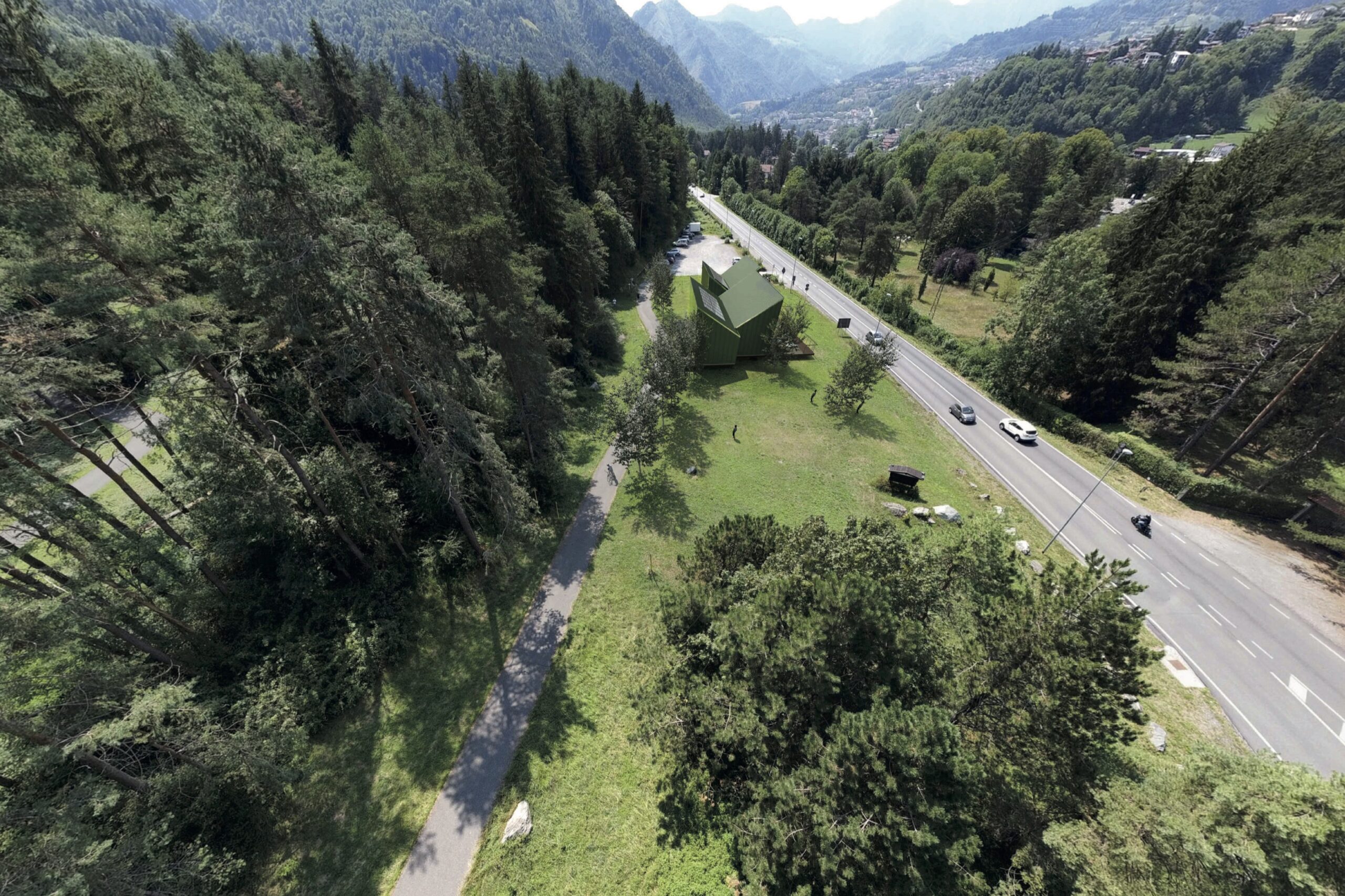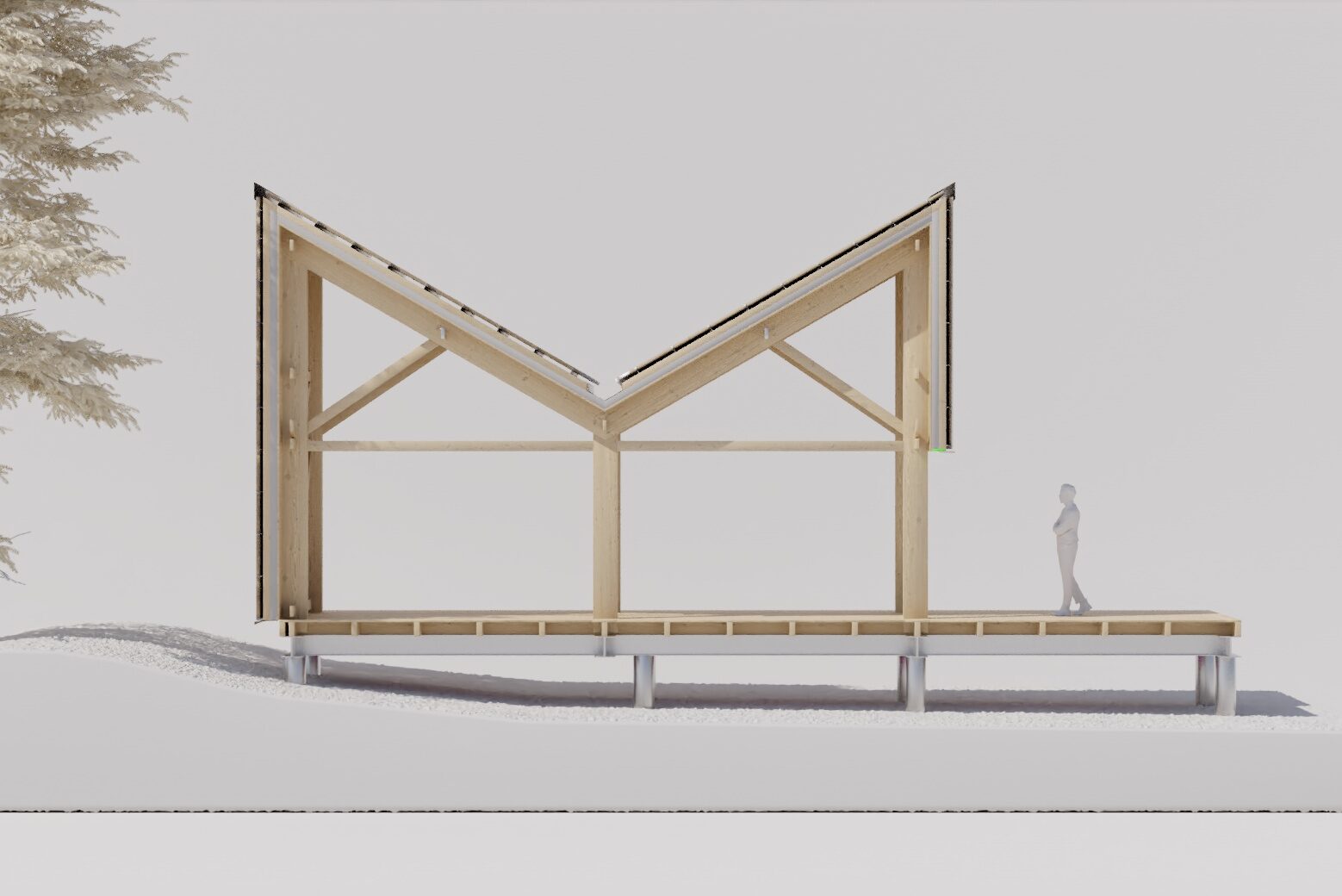 Il progetto prevede la realizzazione di un infopoint a Clusone che integra al suo interno uno spazio bar, un punto informazioni e un deposito per le biciclette, affiancati da aree esterne attrezzate e pensate per l’accoglienza dei visitatori. L’involucro riflettente dell’edificio genera effetti di iridescenza e cangianza: le superfici in policarbonato si tingono dei colori del paesaggio e restituiscono le variazioni di luce del contesto. Il volume risulta così dinamico e mutevole, capace di trasformarsi nell’arco della giornata e delle stagioni. Questa proprietà specchiante produce una vera e propria fusione con l’ambiente naturale, dando all’architettura un carattere diafano e quasi smaterializzato, in continua relazione con il parco e il territorio circostante.