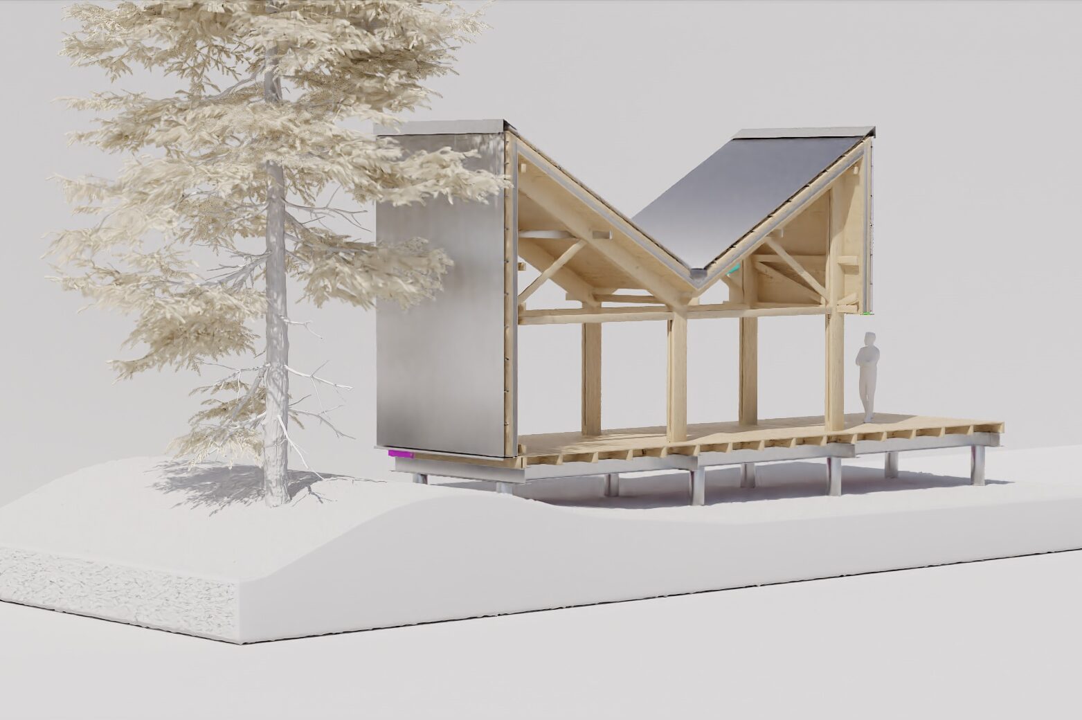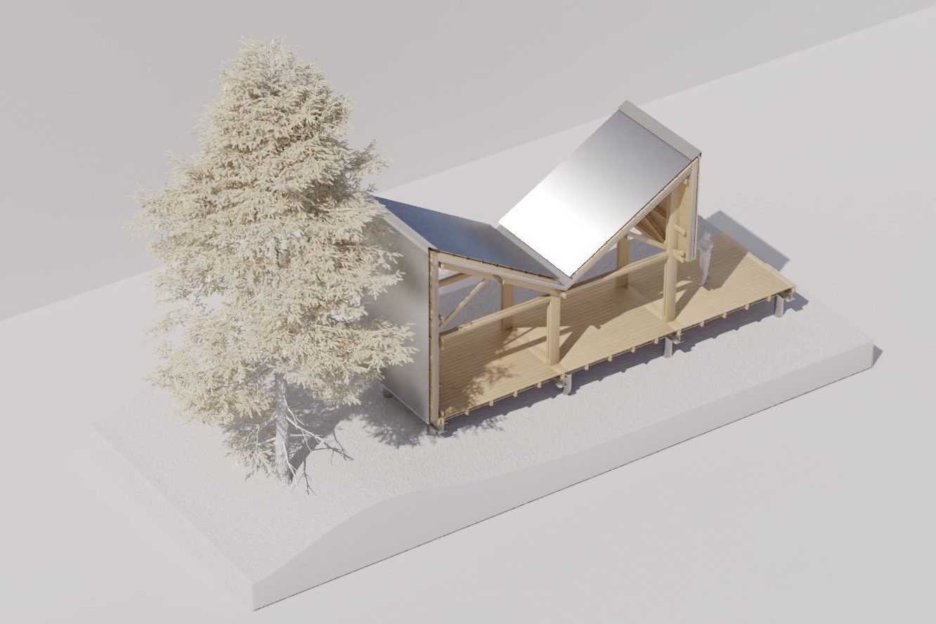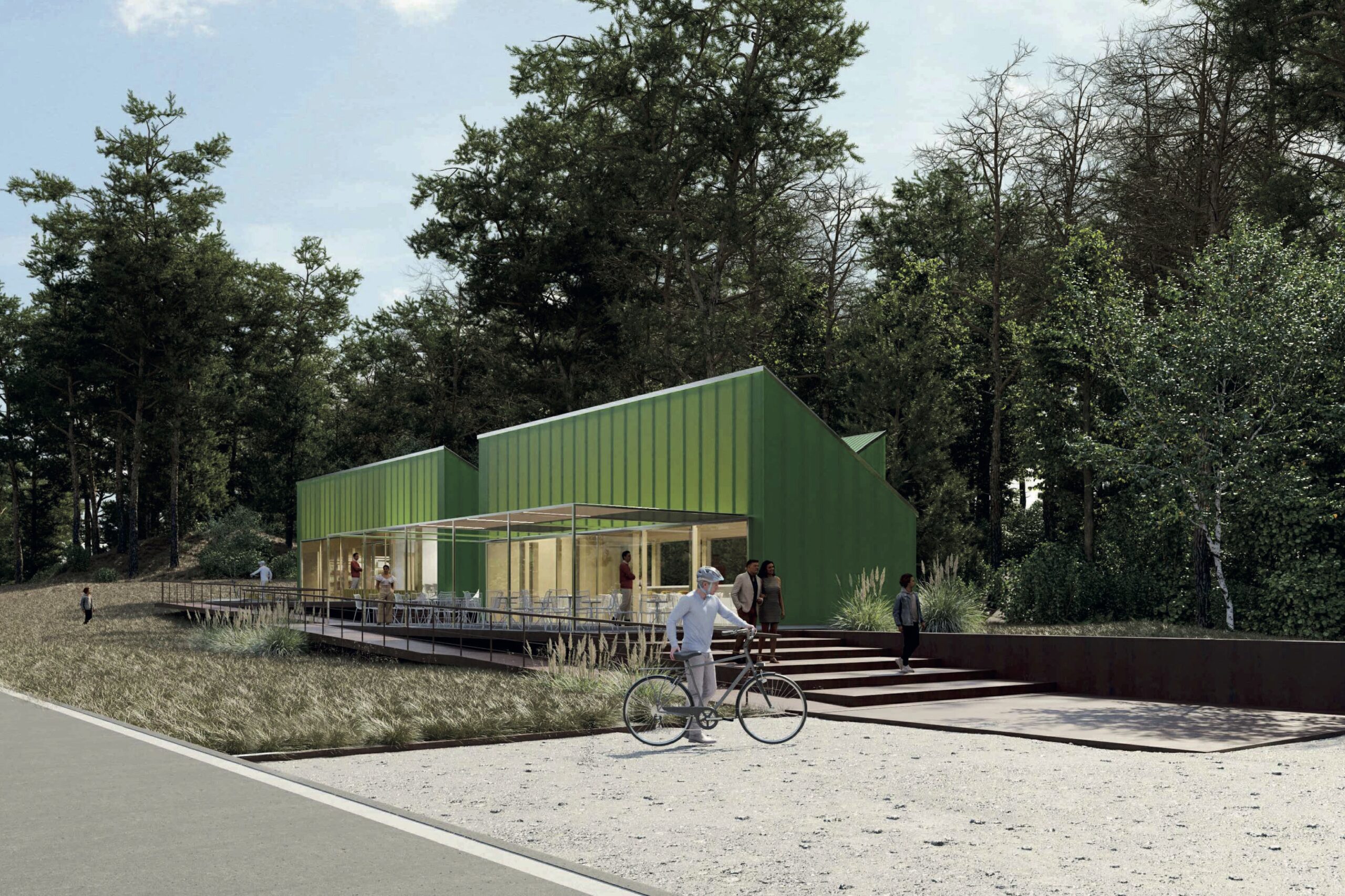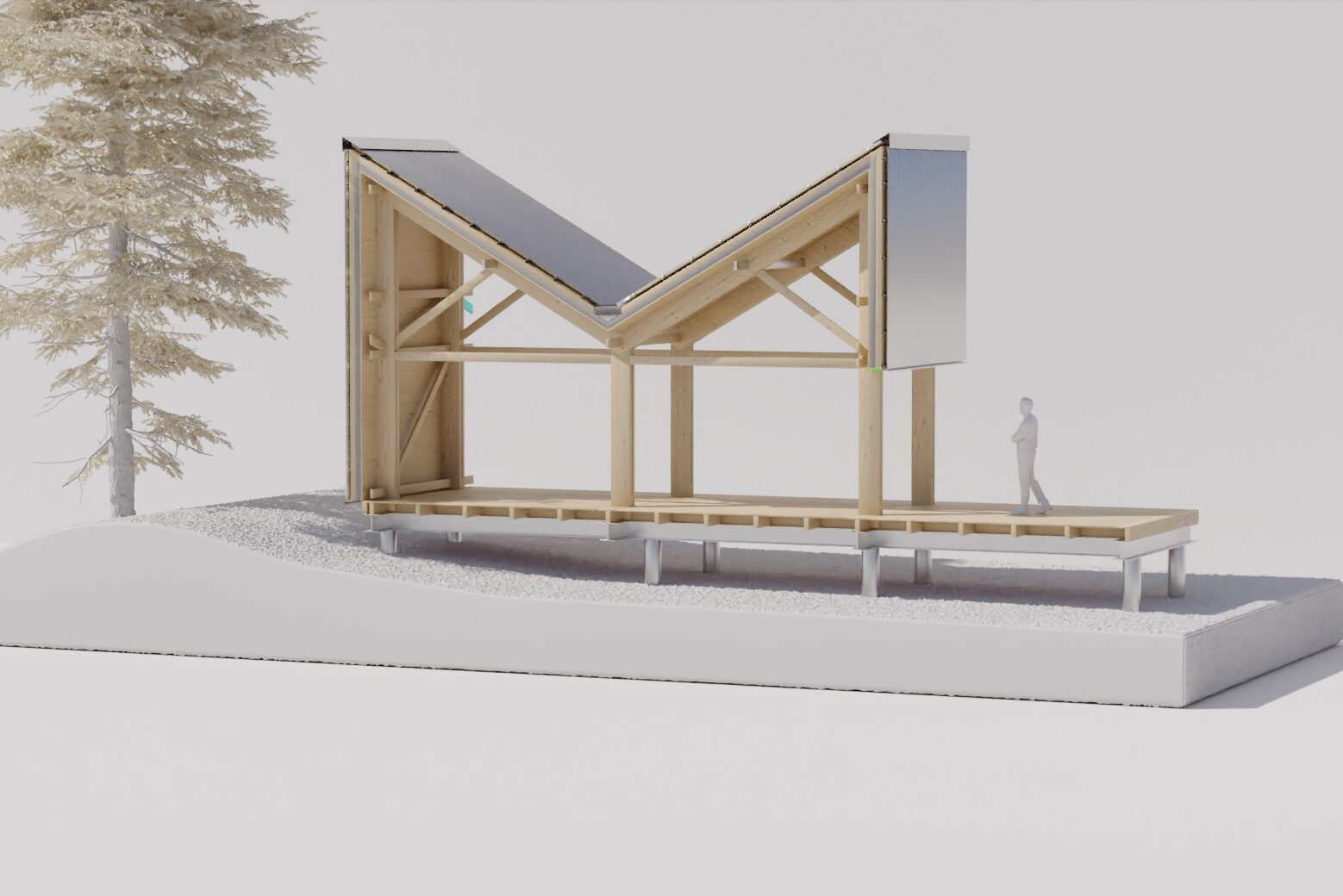 Il progetto prevede la realizzazione di un infopoint a Clusone che integra al suo interno uno spazio bar, un punto informazioni e un deposito per le biciclette, affiancati da aree esterne attrezzate e pensate per l’accoglienza dei visitatori. L’involucro riflettente dell’edificio genera effetti di iridescenza e cangianza: le superfici in policarbonato si tingono dei colori del paesaggio e restituiscono le variazioni di luce del contesto. Il volume risulta così dinamico e mutevole, capace di trasformarsi nell’arco della giornata e delle stagioni. Questa proprietà specchiante produce una vera e propria fusione con l’ambiente naturale, dando all’architettura un carattere diafano e quasi smaterializzato, in continua relazione con il parco e il territorio circostante.