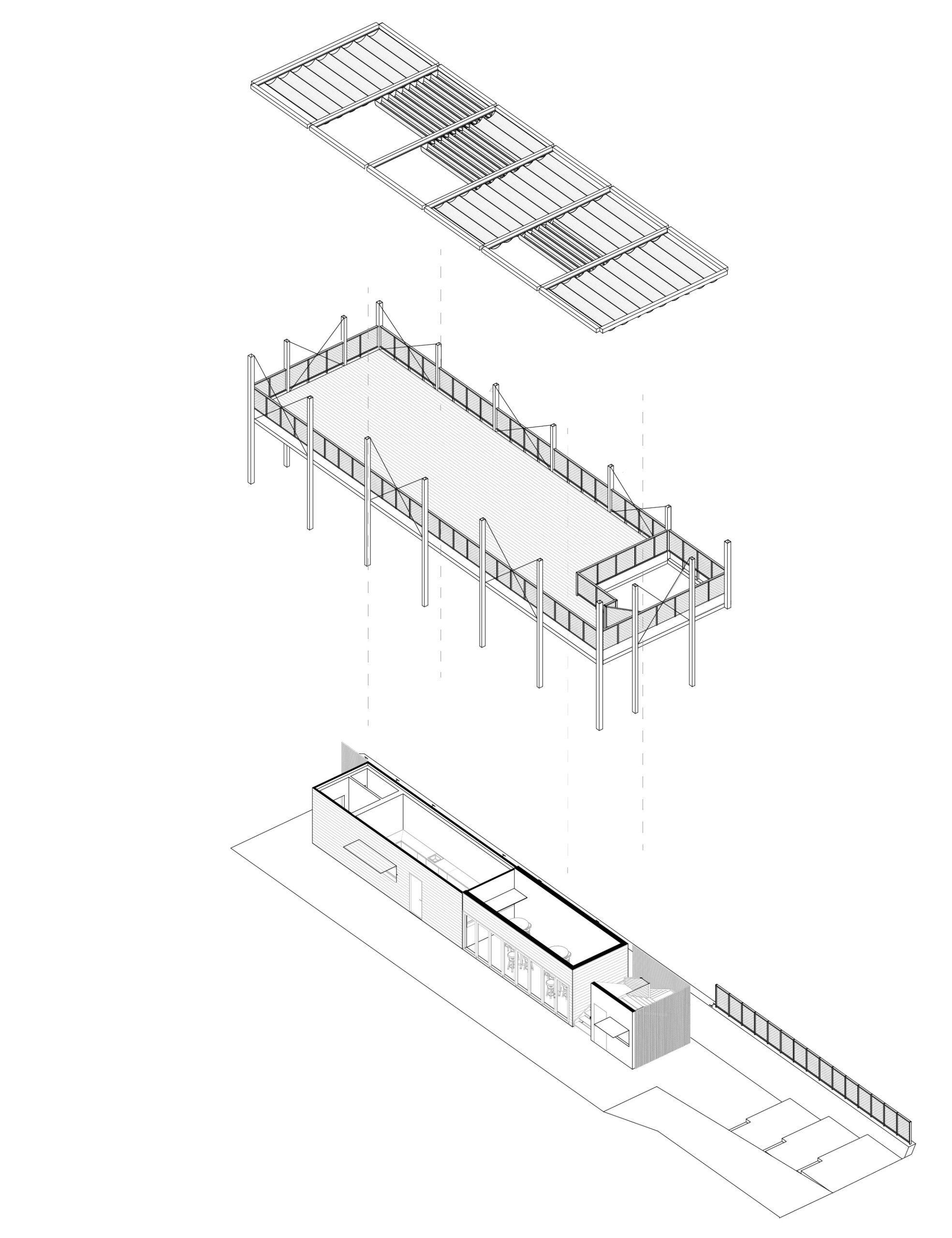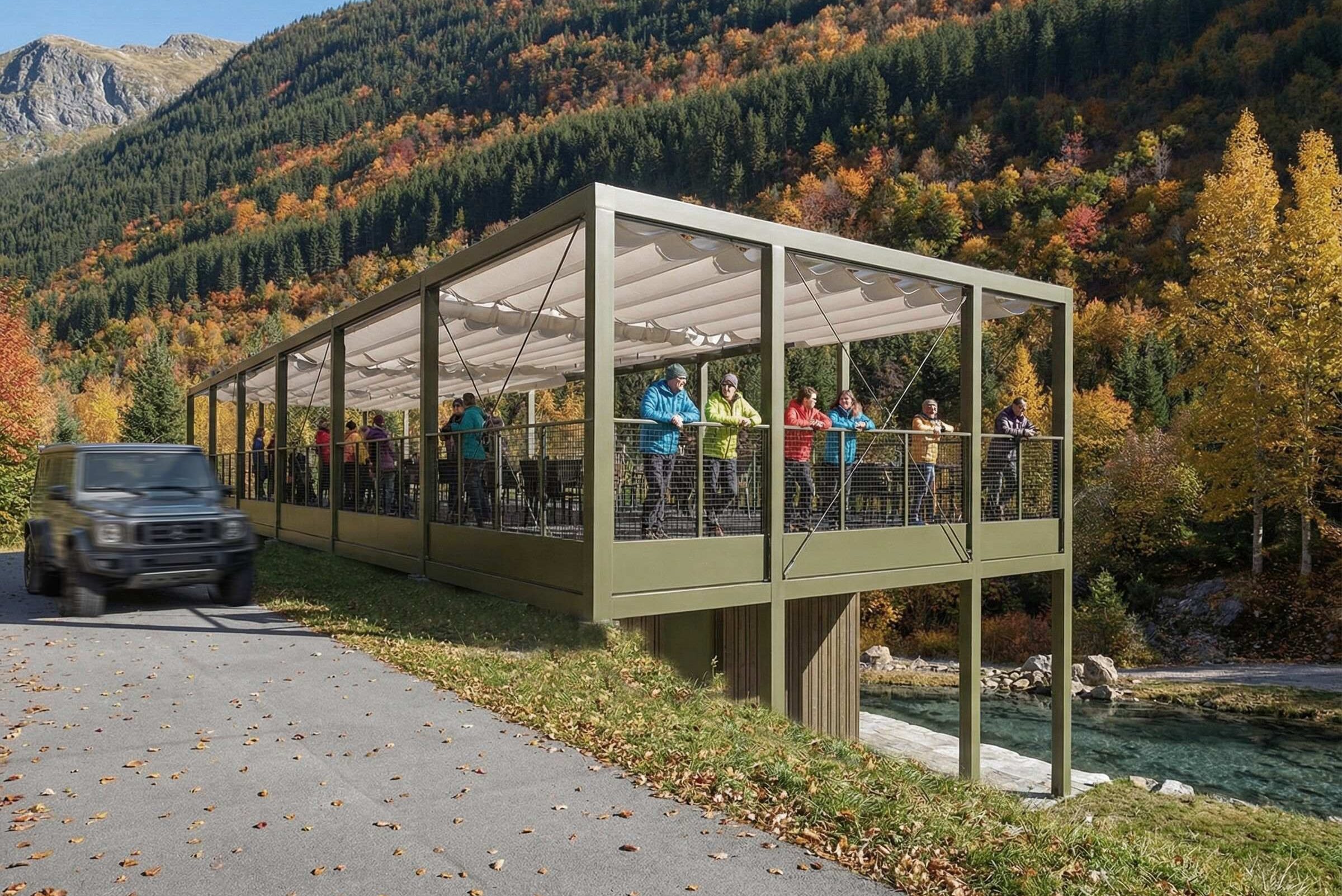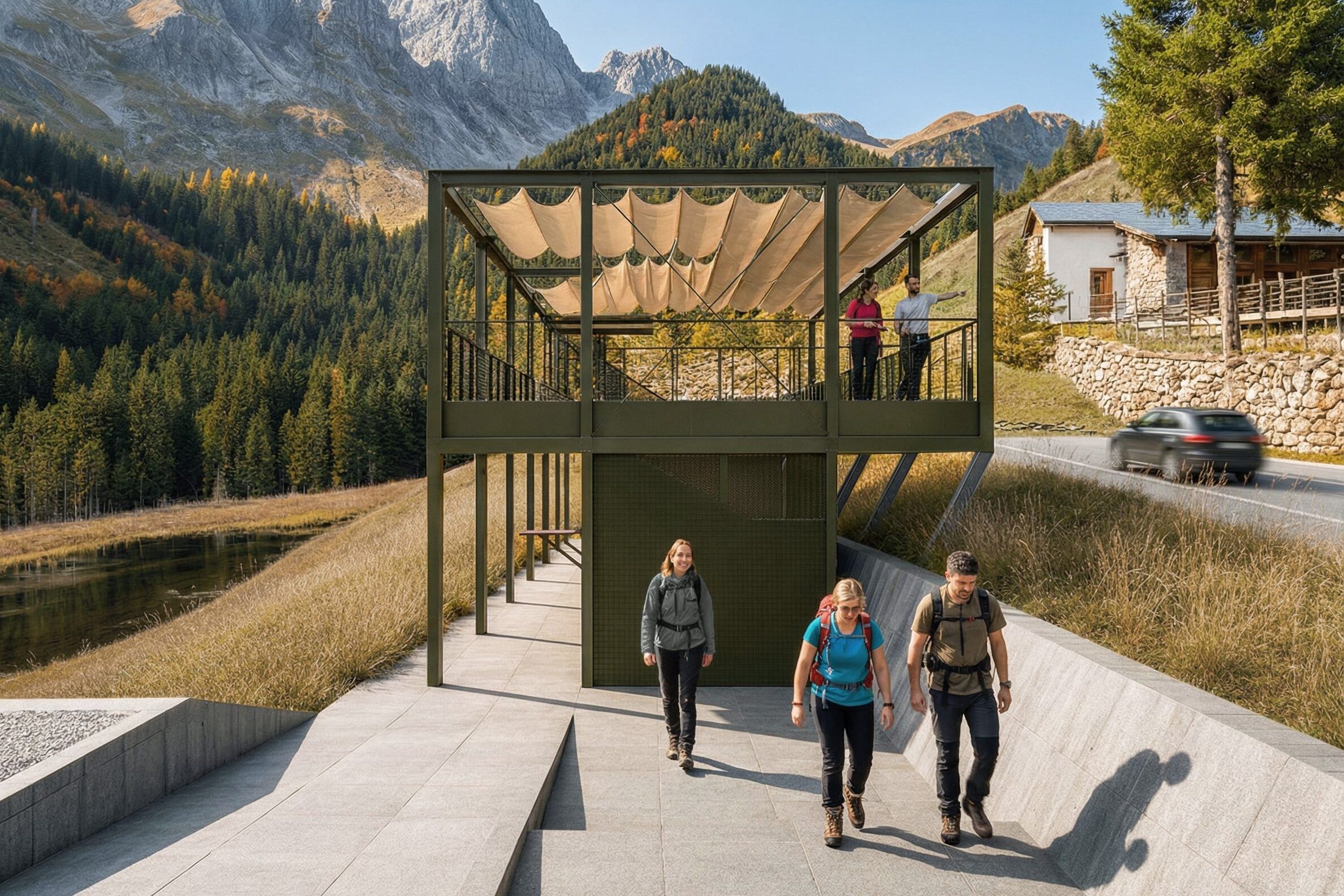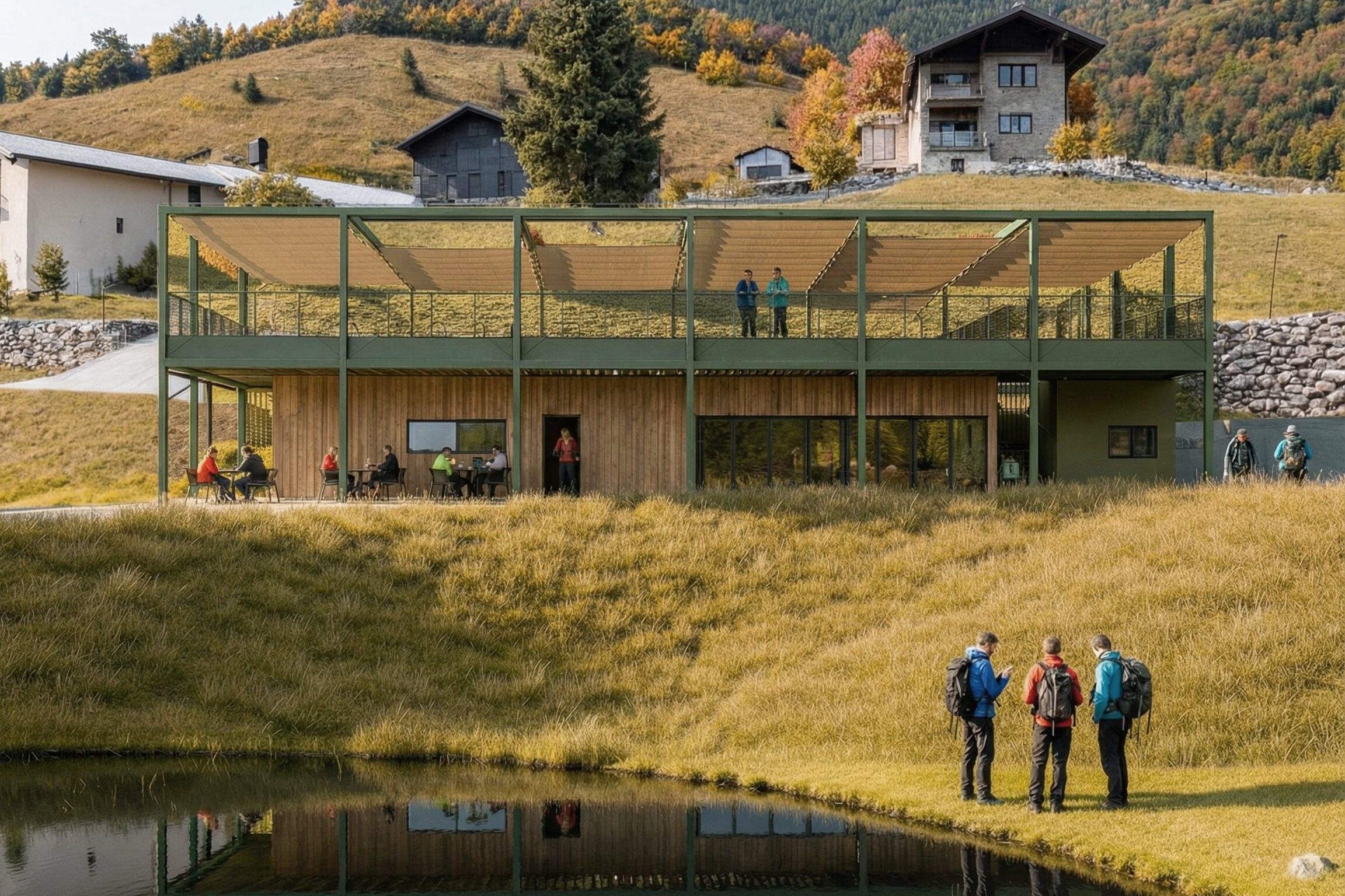Il progetto riguarda l’ampliamento del blocco servizi, dell’info-point e del ristorante del laghetto di Valcanale, in comune di Ardesio (Bergamo), un’area ricreativa immersa nel paesaggio montano e molto frequentata durante la bella stagione. L’intervento nasce dall’esigenza di migliorare la fruibilità del sito, ampliando la cucina e la sala interna del ristorante, estendendo l’info-point e integrando una nuova scala e una rampa di accesso dai parcheggi. Il chiosco esistente viene conservato e inglobato in un esoscheletro metallico perimetrale, una struttura leggera e permeabile che permette di aggiungere nuove funzioni senza alterare il nucleo originario in legno, creando una stratificazione chiara tra vecchio e nuovo. Questo telaio diventa un dispositivo che media il rapporto con il contesto e genera spazi intermedi come portici, logge e una terrazza panoramica in copertura, da cui si apre una vista privilegiata sul laghetto e sulle montagne. La forma aperta e la scelta di materiali coerenti con il luogo, legno naturale, metallo dalle tonalità scure e superfici esterne neutre, permettono un inserimento discreto nel paesaggio, trasformando il chiosco in un elemento capace di valorizzare l’esperienza dei visitatori senza interferire con l’equilibrio visivo dell’area. L’intervento non si limita a espandere un edificio esistente, ma propone un’architettura che rafforza il dialogo con il contesto alpino e qualifica l’intera area di Valcanale.