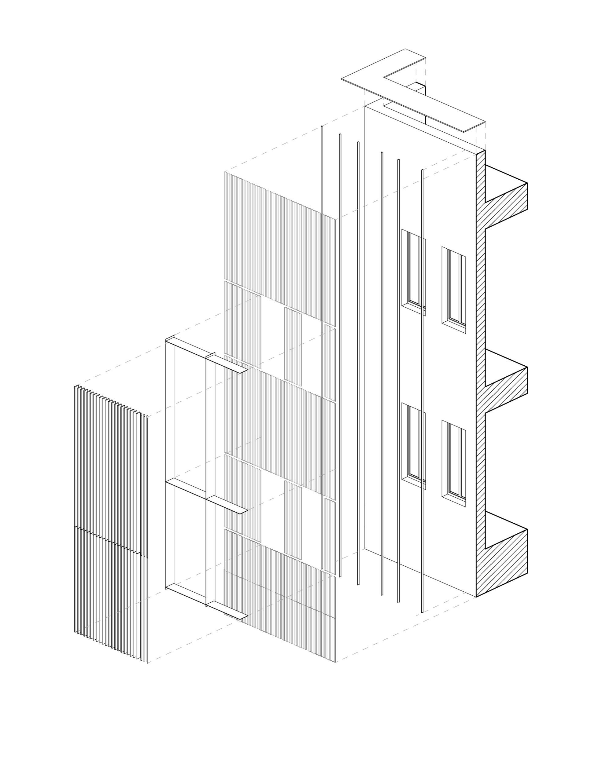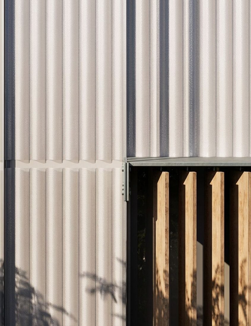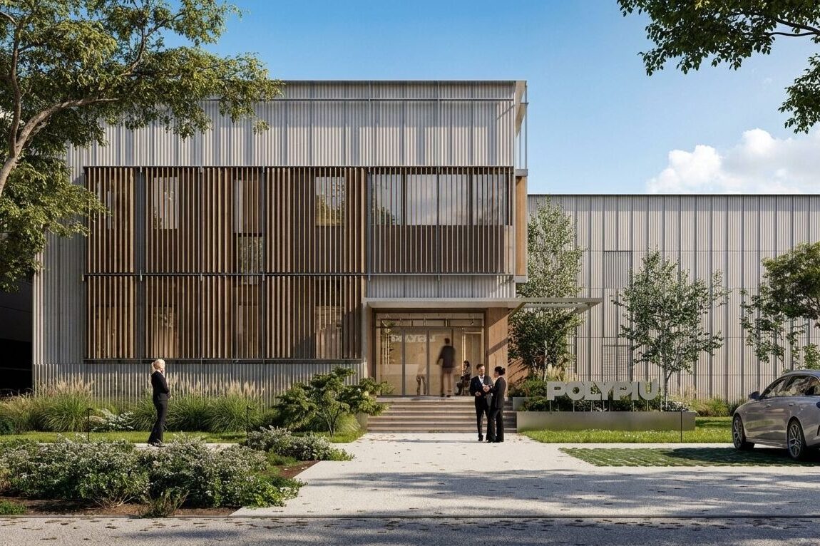 Il progetto riguarda la riqualificazione della facciata della sede operativa e del magazzino di Polypiù, azienda specializzata nella produzione di policarbonato. L’intervento nasce dall’idea di rendere immediatamente percepibile dall’esterno il cuore dell’attività aziendale, utilizzando proprio il policarbonato come elemento principale dell’involucro architettonico. Una nuova pelle in policarbonato neutro ondulato avvolge l’edificio esistente, generando un gioco dinamico di riflessi e trasparenze che varia durante il giorno in relazione alla luce solare. Nei punti in corrispondenza delle aperture, una serie di sovrastrutture in legno con lamelle orientabili permette di controllare l’ingresso della luce naturale, garantendo comfort interno e un ritmo visivo più articolato sulla facciata. Il progetto si basa così sulla contrapposizione e sul dialogo tra materiali differenti (policarbonato, legno e acciaio) che insieme definiscono un’immagine contemporanea e coerente con l’identità dell’azienda.